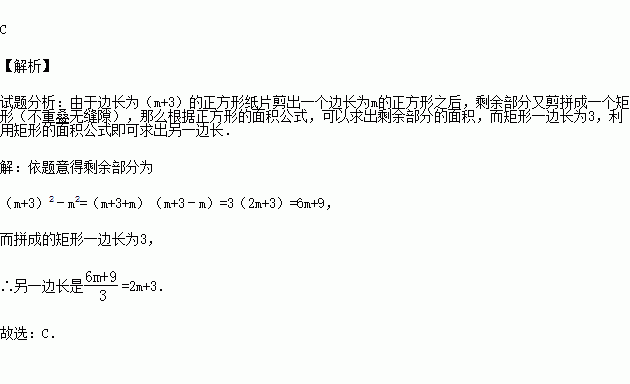 (2012•定西)如图,边长为(m+3)的正方形纸片,剪出一个边长为m的正方形之后,剩余部分可剪拼成一个矩形(不重叠无缝隙),若拼成的矩形一边长为3,则另一边长是( )