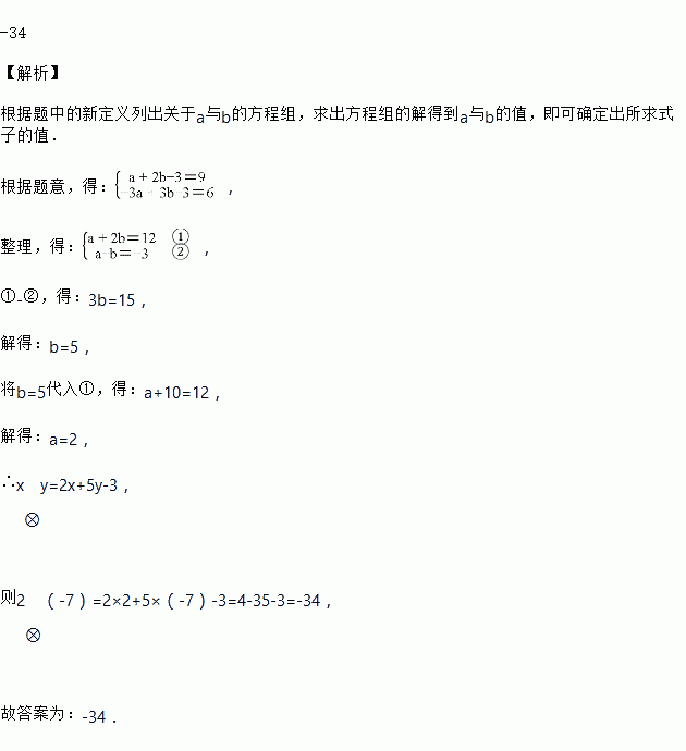 对于x,y,定义新运算x?y=ax+by﹣3(其中a,b是常数),等式的右边是通常的加法与乘法运算,已知1?2=9,(﹣3)?3=6,则2?(﹣7)=_____.