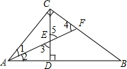分析 在△ABC中,AF平分∠CAB、AF=BF求得∠B=∠2=∠1=60°,根据外角性质可得∠4=60°,在RT△ADE中可得∠3=∠5=60°,进而可知∠4=∠5=60°,得证.