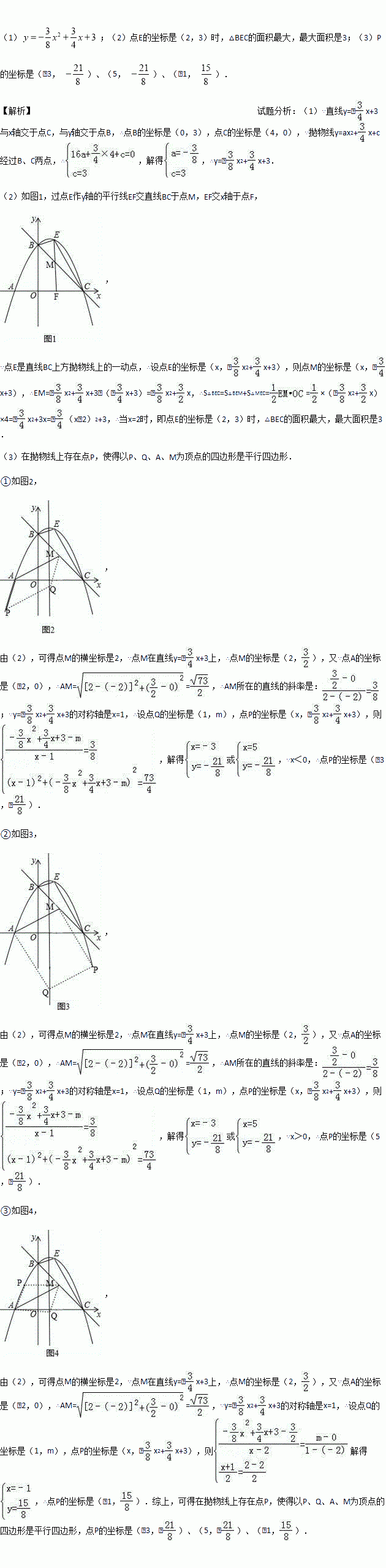 (3)在(2)的结论下,过点E作y轴的平行线交直线BC于点M,连接AM,点Q是抛物线对称轴上的动点,在抛物线上是否存在点P,使得以P、Q、A、M为顶点的四边形是平行四边形?如果存在,请直接写出点P的坐标;如果不存在,请说明理由.
