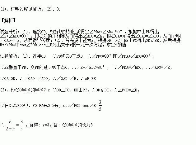如图,已知AB是⊙O的直径,点P在BA的延长线上,PD切⊙O于点D,过点B作BE垂直于PD,交PD的延长线于点C,连接AD并延长,交BE于点E。