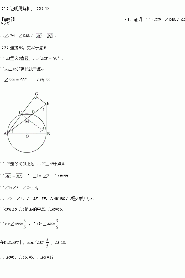 如图,AB是⊙O的直径,CD为⊙O 的弦,过点B作⊙O的切线,交AD的延长线于点E,连接AC并延长,过点E作EG⊥AC的延长线于点G,并且∠GCD= ∠GAB.