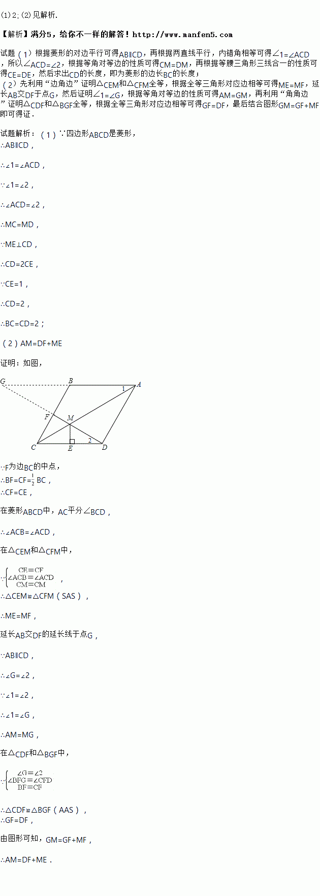 已知:如图,在菱形ABCD中,F为边BC的中点,DF与对角线AC交于点M,过M作ME⊥CD于点E,∠1=∠2.