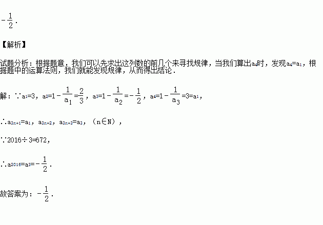 (2015秋•丹江口市期末)有一列数:a1,a2,a3,…,从第二个数开始,每一个数都等于1与它前面那个数的倒数的差,若a1=3,则a2016= .