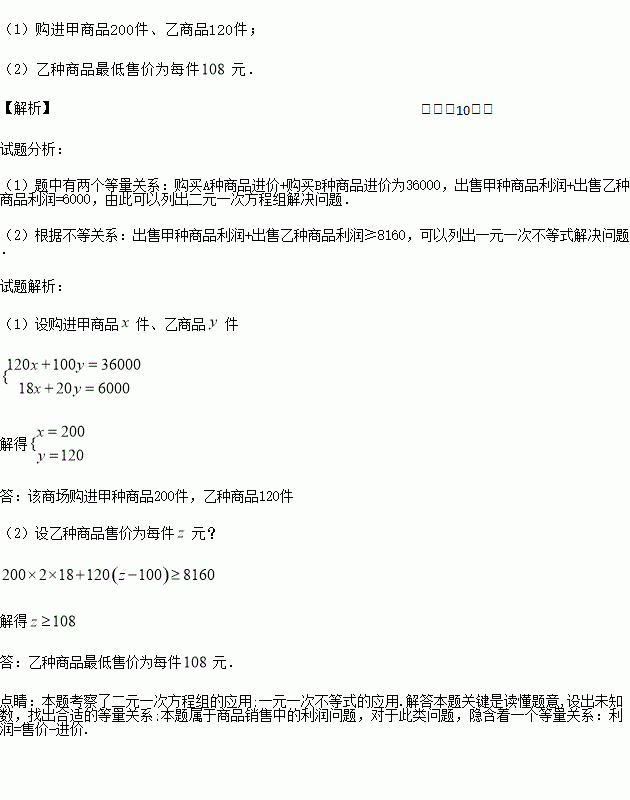 (2)商店第二次以原进价购进甲、乙两种商品.购进乙种商品的件数不变,而购进甲种商品的件数是第一次的2倍,甲种商品按原售价出售,而乙种商品打折降价销售。若两种商品销售完毕,要使第二次经营活动获利不少于8160元,乙种商品最低售价为每件多少元?