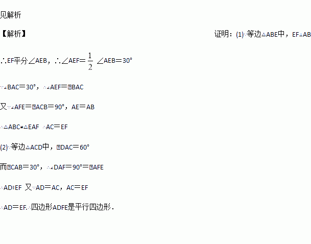 如图,分别以Rt△ABC的直角边AC及斜边AB向外作等边△ACD、等边△ABE.已知∠BAC=30°,EF⊥AB,垂足为F,连结DF.