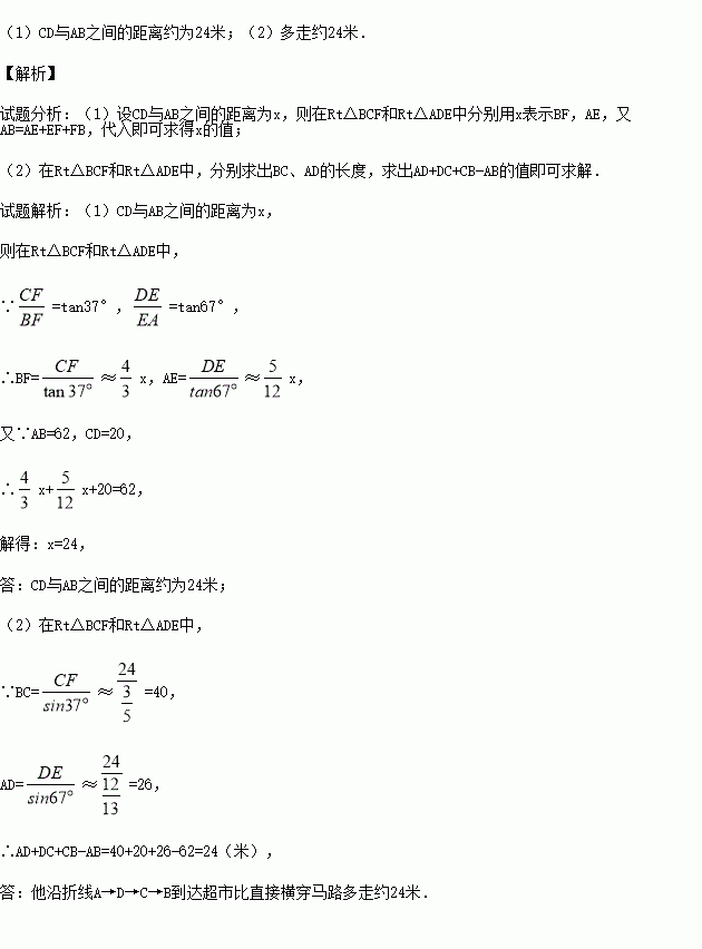 如图,马路的两边CF,DE互相平行,线段CD为人行横道,马路两侧的A,B两点分别表示车站和超市.CD与AB所在直线互相平行,且都与马路的两边垂直,马路宽20米,A,B相距62米,∠A=67°,∠B=37°.