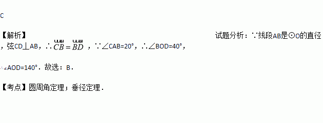 如图,线段AB是⊙O的直径,弦CD丄AB,∠CAB=20°,则∠AOD等于( )