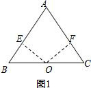 解:(1)证明:如图1,过点O作OE、OF分别与AB、AC垂直于点E、F,