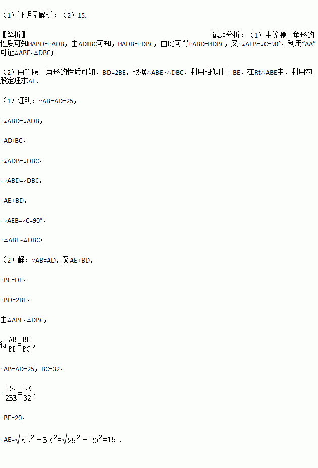 如图,已知:在直角梯形ABCD中,AD∥BC,∠C=90°,AB=AD=25,BC=32,连接BD,AE⊥BD,垂足为E.