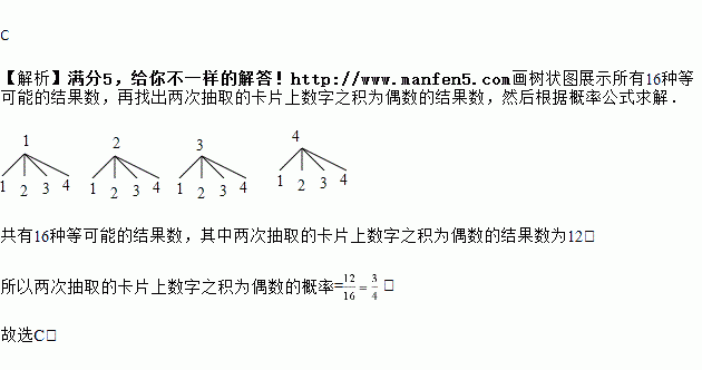 一个不透明的袋中有四张完全相同的卡片,把它们分别标上数字1、2、3、4.随机抽取一张卡片,然后放回,再随机抽取一张卡片,则两次抽取的卡片上数字之积为偶数的概率是( )
