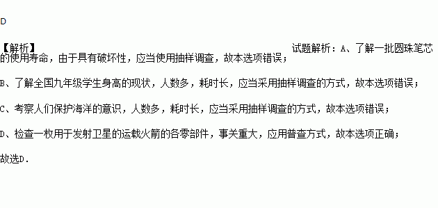 A. 了解一批圆珠笔的寿命 B. 了解全国九年级学生身高的现状