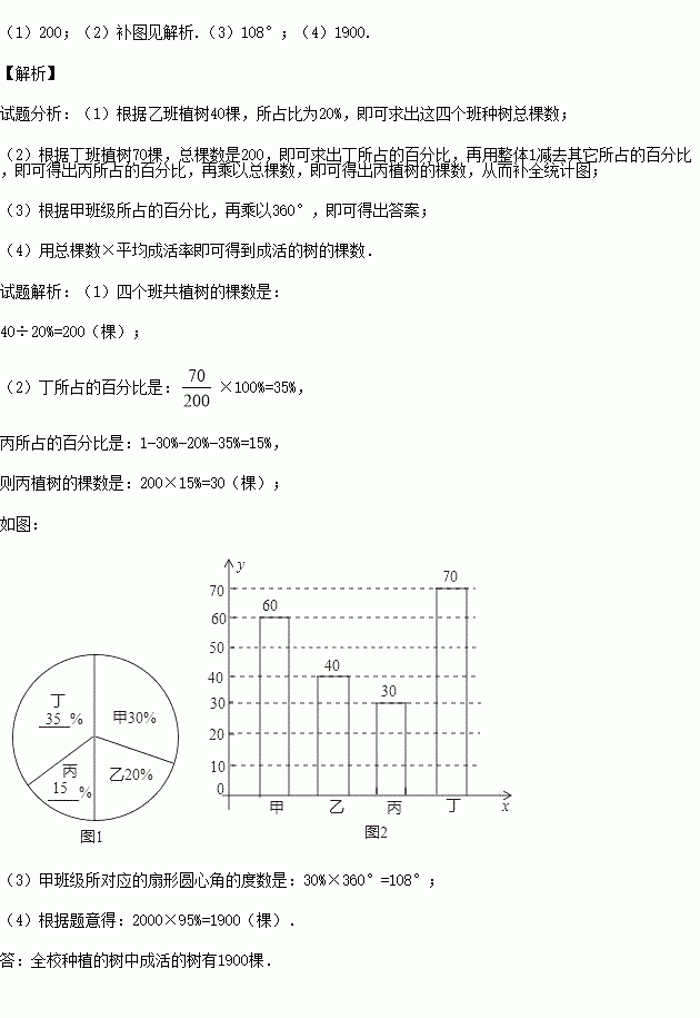 ijÖÐѧ¿ªÕ¹¡°ÂÌ»¯¼ÒÏç¡¢Ö²Ê÷ÔìÁÖ¡±»î¶¯£¬ÎªÁ˽âȫУֲÊ÷Çé¿ö£¬¶Ô¸ÃУ¼×¡¢ÒÒ¡¢±û¡¢¶¡Ëĸö°à¼¶Ö²Ê÷Çé¿ö½øÐÐÁ˵÷²é£¬½«ÊÕ¼¯µÄÊý¾ÝÕûÀí²¢»æÖƳÉͼ1ºÍͼ2Á½·ùÉв»ÍêÕûµÄͳ¼ÆÍ¼£¬Çë¸ù¾ÝͼÖеÄÐÅÏ¢£¬Íê³ÉÏÂÁÐÎÊÌ⣺