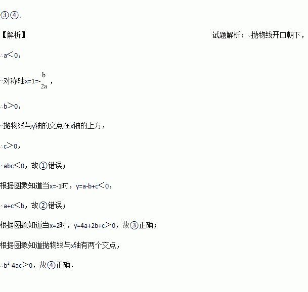 0)的图象,有下列4个结论:①abc>0;②b>a+c;③4a+2b+c>0;④b2-4ac>0;其中正确的是_____________.