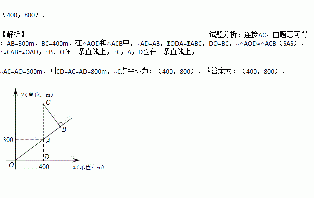 如图是根据某公园的平面示意图建立的平面直角坐标系,公园的入口位于坐标原点O,古塔位于点A(400,300),从古塔出发沿射线OA方向前行300m是盆景园B,从盆景园B向左转90°后直行400m到达梅花阁C,则点C的坐标是_________.