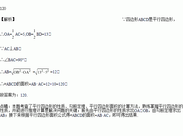 如图,□ABCD的两条对角线AC与BD相交于点O,且AC ⊥ AB,已知AC = 10,BD = 26,那么□ABCD的面积为______________.