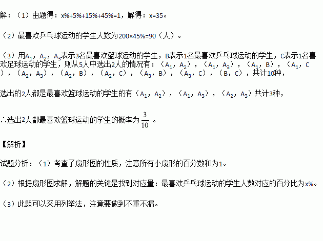(3)若由3名最喜欢篮球运动的学生,1名最喜欢乒乓球运动的学生,1名最喜欢足球运动的学生组队外出参加一次联谊活动.欲从中选出2人担任组长(不分正副),列出所有可能情况,并求2人均是最喜欢篮球运动的学生的概率.