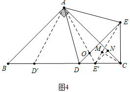 (3)如图4中,当E在BC上时,E记为E′,D记为D′,连接EE′.作CM⊥EE′于M,E′N⊥AC于N,DE交AE′于O.![]()