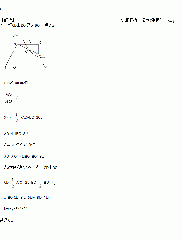 的图象恰好经过斜边A′B的中点C,S△ABO=16,tan∠BAO=2,则k的值为( )