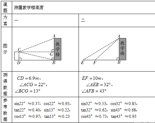 某校数学课题学习小组在“测量教学楼高度”的活动中,设计了以下两种方案: