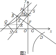 (3)通过度量可得PQ约为PM+QN的1.414倍,由此可以猜想PQ=$\sqrt{2}$(PM+QN).过点P作PS∥x轴,交直线AC于S,过点Q作QR∥x轴,交直线AC于R,如图2.易证PS+QR=$\sqrt{2}$PM+$\sqrt{2}$QN=$\sqrt{2}$(PM+QN),只需证到PQ=PS+QR即可.可用待定系数法依次求出直线AC为y=x+3、直线PQ的表达式为y=k′x+3k′+3.,设点P的坐标为(x1,y1),点Q的坐标为(x2,y2),易得PS+QR=(k′-1)(x1+x2)+6k′.由P(x1,y1),Q(x2,y2)是直线y=k′x+3k′+3与双曲线y=-$\frac{9}{2x}$的交点,可得x1、x2是方程k′x+3k′+3=-$\frac{9}{2x}$即2k′x2+6(k′+1)x+9=0的解,根据根与系数的关系可得x1+x2=-$\frac{3(k′+1)}{k′}$,x1•x2=$\frac{9}{2k′}$,从而得到PS+QR=$\frac{3(k{′}^{2}+1)}{k′}$,PQ2=(x1-x2)2+(y1-y2)2=(k′2+1)(x1-x2)2=(k′2+1)[(x1+x2)2-4x1x2]=$\frac{9(k{′}^{2}+1)2}{k{′}^{2}}$,即可得到PQ=$\frac{3(k{′}^{2}+1)}{k′}$,从而得到PQ=PS+QR=$\sqrt{2}$(PM+QN).