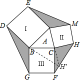 分析 把△CFH绕点C顺时针旋转90°得到△BCH′,然后判断出A、C、H′三点共线,再根据等底等高的三角形的面积相等可得S△BCH′=S△ABC,即S△CFH=S△ABC,同理可得S△BDG=S△ABC,S△AEM=S△ABC,从而得到阴影部分的面积的和=3S△ABC,再根据三角形的面积公式,当AB⊥BC时,面积最大列式计算即可得解.