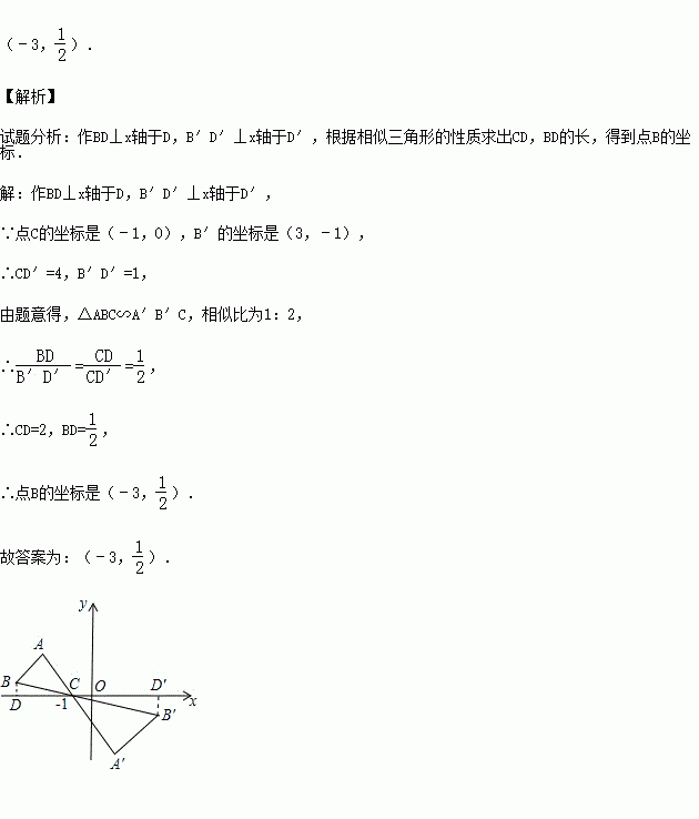 (2015秋•乐至县期末)如图,△ABC中,A、B两个顶点在x轴的上方,点C的坐标是(﹣1,0).以点C为位似中心,在x轴的下方作△ABC的位似图形△A′B′C,并把△ABC的边长放大到原来的2倍.设B′的坐标是(3,﹣1),则点B的坐标是 .