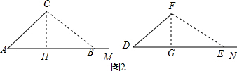 (3)当BC≥CA时,也能使△ABC≌△DEF,①当BC=CA时,△ABC和△DEF是有一个底角相等的等腰三角形,根据AAS易证两三角形全等,②当BC>CA时,在射线AM上取点B,使BC>CA,连接BC,以F为圆心,CB长为半径画弧交射线DN于点E,连接FE,则BC=EF,过点F作FG⊥DE于点G,证明△CAH≌△FDG(AAS),得到CH=FG,通过Rt△CBH≌Rt△FEG(HL),得到∠CBA=∠FED,证得△ABC≌△DEF(AAS).