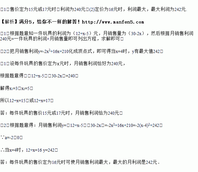 某商品店经营儿童益智玩具,已知成批购进时的单价是5元,调查发现销售单价是12元时,月销售量30件。而销售单价上涨1元月销售量就减少2件.(1)每件玩具的售价定为多少元时,月销售利润恰好为240元?(2)每件玩具的售价定为多少元时可是月销售利润最大?最大的月利润为多少元?