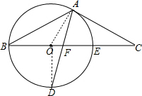 分析 (1)连结OA、OD,如图,根据垂径定理的推理,由D为BE的下半圆弧的中点得到OD⊥BE,则∠D+∠DFO=90°,再由AC=FC得到∠CAF=∠CFA,根据对顶角相等得∠CFA=∠DFO,所以∠CAF=∠DFO,加上∠OAD=∠ODF,则∠OAD+∠CAF=90°,于是根据切线的判定定理即可得到AC是⊙O的切线;