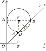 分析 作PH⊥y轴于H,PC⊥AB于C,作PE⊥x轴于E交AB于D,如图,先根据切线的性质得PH=2,即⊙P的半径为2,再根据垂径定理,由PC⊥AB得到BC=CD=$\frac{1}{2}$AB=$\sqrt{5}$,接着在Rt△BPC中利用勾股定理可计算出PC=1,由直线y=x为第一、三象限的角平分线得到∠DOE=45°,则∠ODE=45°,DE=OE=2,然后判断△PCD为等腰直角三角形得到PD=$\sqrt{2}$PC=2$\sqrt{2}$,所以PE=PD+DE=2$\sqrt{2}$+3,即a=2$\sqrt{2}$+3.