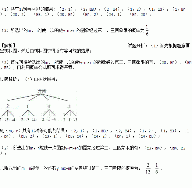 有四张正面分别标有数字2,1,﹣3,﹣4的不透明卡片,它们除数字外其余全部相同,现将它们背面朝上,洗匀后从四张卡片中随机地摸取一张不放回,将该卡片上的数字记为m,再随机地摸取一张,将卡片上的数字记为n.