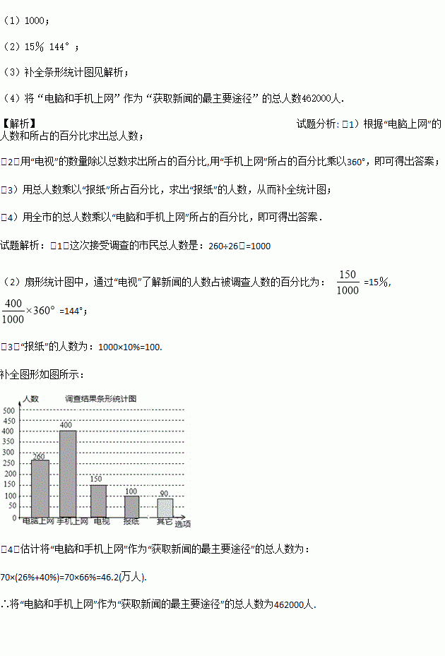 (4)若该市约有70万人,请你估计其中将“电脑和手机上网”作为“获取新闻的最主要途径”的总人数.