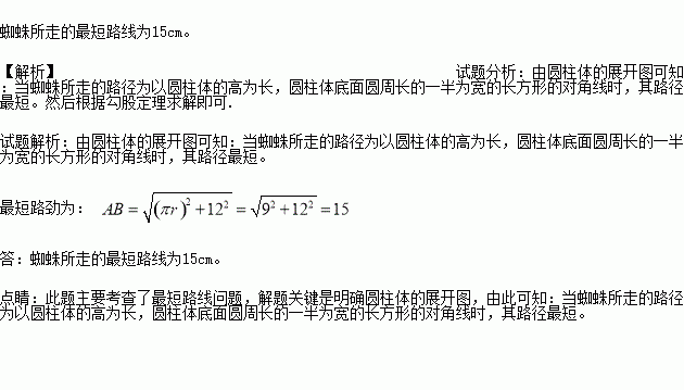 如图所示,有一个圆柱体,高为12cm,底面半径为3cm,在圆柱下底面A处有一只蜘蛛.它想到上底面B处捉住一只苍蝇,则蜘蛛所走的最短路线长应为多少cm(π取3.0).