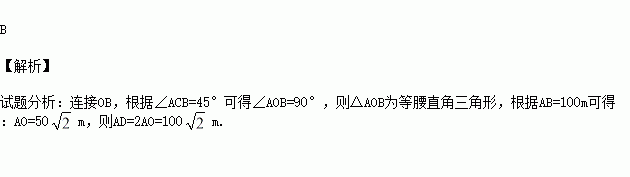 一个圆形人工湖如图所示,弦AB是湖上的一座桥.已知桥AB长100m,测得∠ACB=45°.则 这个人工湖的直径AD为 ( )