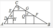分析:因为Rt△ABC内有边长分别为a、b、c的三个正方形,所以图中三角形都相似,且与a、b、c关系密切的是△DHE和△GQF,只要它们相似即可得出所求的结论.