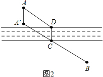 (2)如图2,在一条河的两岸有A,B 两个村庄,现在要在河上建一座小桥,桥的方向与河岸方向垂直,桥在图中用一条线段CD表示.试问:桥CD建在何处,才能使A到B的路程最短呢?请在图中画出桥CD的位置.