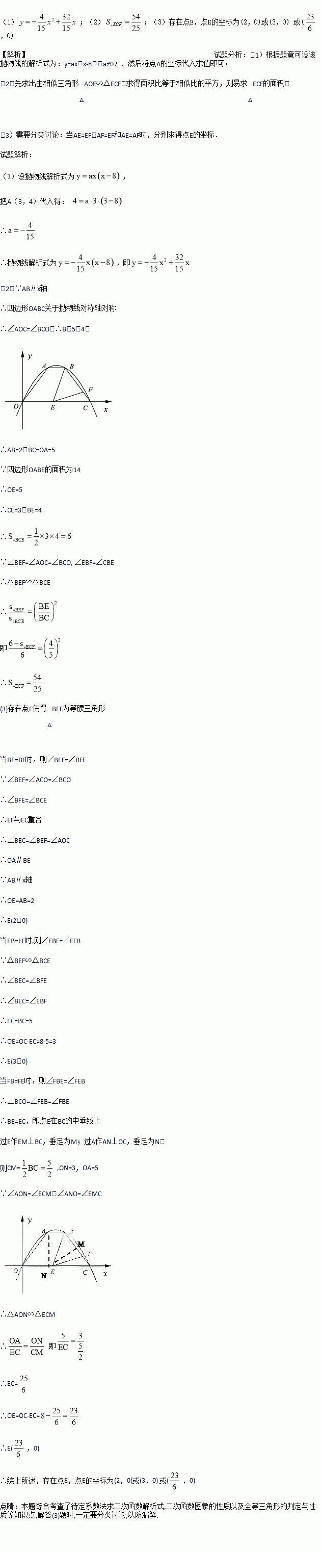 如图,一条抛物线经过原点和点C(8,0),A、B是该抛物线上的两点,AB∥x轴,点A坐标为(3,4),点E在线段OC上,点F在线段BC上,且满足∠BEF=∠AOC.