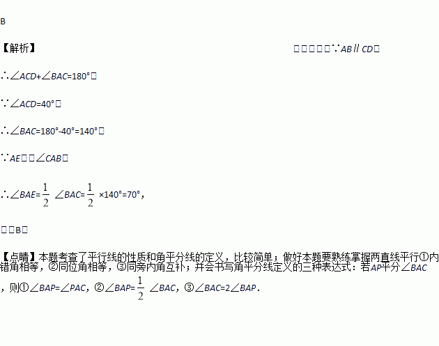 如图,直线AB∥CD,AE平分∠CAB.AE与CD相交于点E,∠ACD=40°,则∠BAE的度数是( )