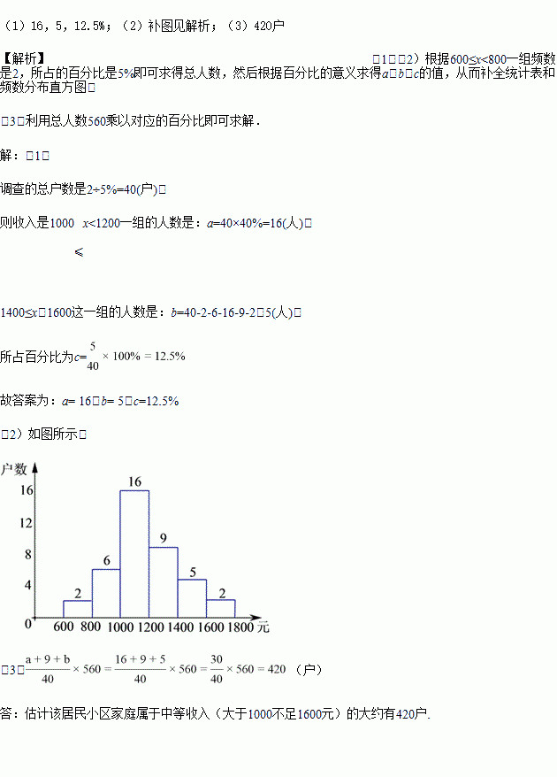 £¨3£©Çë¹À¼Æ¸Ã¾ÓÃñÐ¡Çø¼ÒÍ¥ÊôÓÚÖеÈÊÕÈ루´óÓÚ1000²»×ã1600Ôª£©µÄ´óÔ¼ÓжàÉÙ»§£¿
