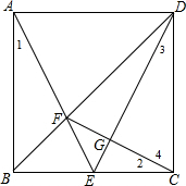 分析 如图,利用正方形的性质得BA=BC=CD,∠ABF=∠CBF=45°,则可根据“SAS”证明△ABF≌△CBF,得到∠1=∠2,再证明△ABE≌△DCE得到∠1=∠3,则∠2=∠3,由于∠2+∠4=90°,则∠3+∠4=90°,于是可判断CF⊥DE.