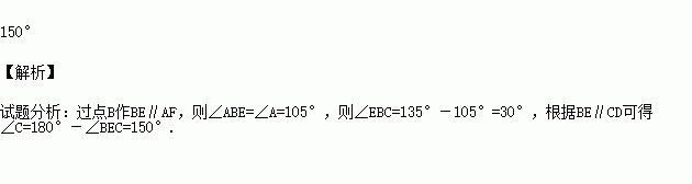 如图,一条铁路修到一个村子边时,需拐弯绕道而过,如果第一次拐的角∠A是105度,第二次拐的角∠B是135度,第三次拐的角是∠C,这时的道路恰好和第一次拐弯之前的道路平行,那么∠C= ;