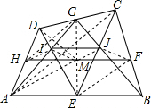 分析 连接GE交HF于M,连接AC,GH,EF,DM,AM,HI,IM,JM,JF,根据三角形的中位线的性质得到GH∥AC∥EF,GH=EF=$\frac{1}{2}$AC,推出四边形EFGH是平行四边形,由平行四边形的性质得到HM=FM,GM=EM,于是得到S△IHM=$\frac{1}{2}$(S△MAI-S△MDI)=$\frac{1}{2}$(S△MAG-S△MDE)=$\frac{1}{8}$(S△GAB-S△ECD),同理S△JMF=$\frac{1}{8}$(S△GAB-S△ECD),等量代换得到S△IHM=S△JMF,由于HM=MF,于是得到I,J两点到HF的距离相等,即可得到结论.