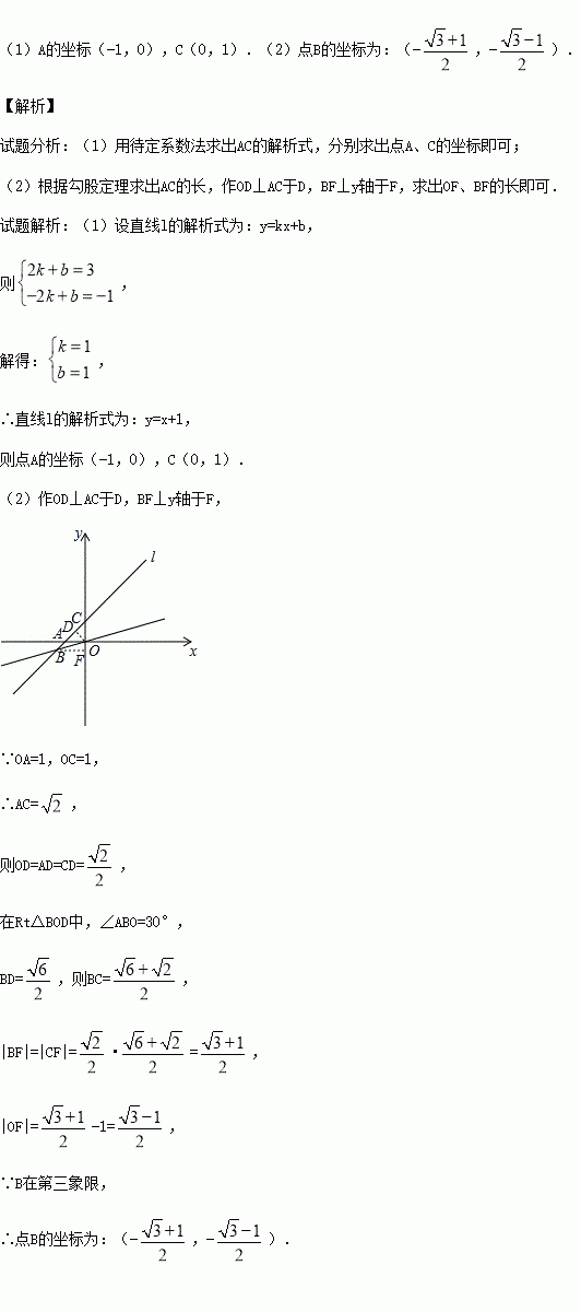直线l经过(2,3)和(-2,-1)两点,它还与x轴交于A点,与y轴交于C点,与经过原点