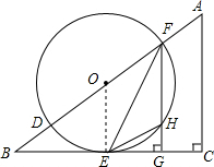 分析 (1)首先连接OE,由在△ABC中,∠C=90°,FG⊥BC,可得FG∥AC,又由∠OFE=$\frac{1}{2}$∠A,易得EF平分∠BFG,继而证得OE∥FG,证得OE⊥BC,则可得BC是⊙O的切线;