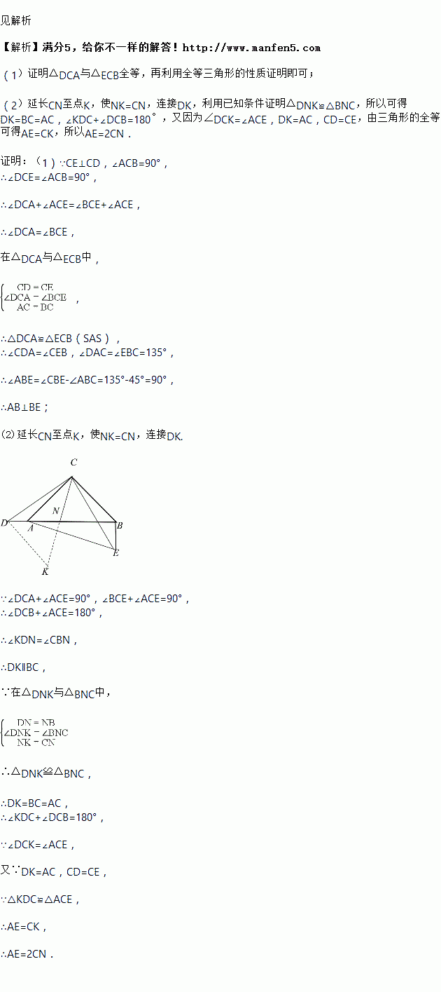 如图,等腰直角△ABC中,∠ACB=90°,点D在BA的延长线上,连接CD,过点C作CE⊥CD,使CE=CD,连接BE,若点N为BD的中点,连接CN、BE.