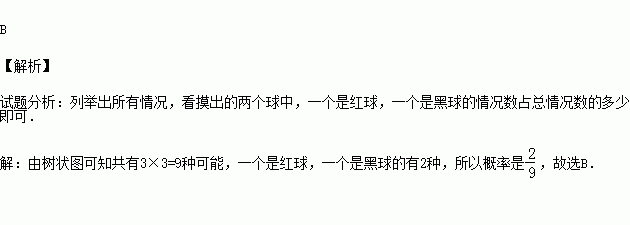 在一个布袋中装着只有颜色不同,其它都相同的红、黄、黑三种小球各一个,从中任意摸出一个球,记下颜色后放回并搅匀,再摸出一个球,两次摸球所有可能的结果如图所示,则摸出的两个球中,一个是红球,一个是黑球的概率是( )