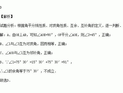 (2004•青海)如图所示,直线AB,CD相交于点O,OE⊥AB于点O,OF平分∠AOE,∠1=15°30′,则下列结论中不正确的是( )