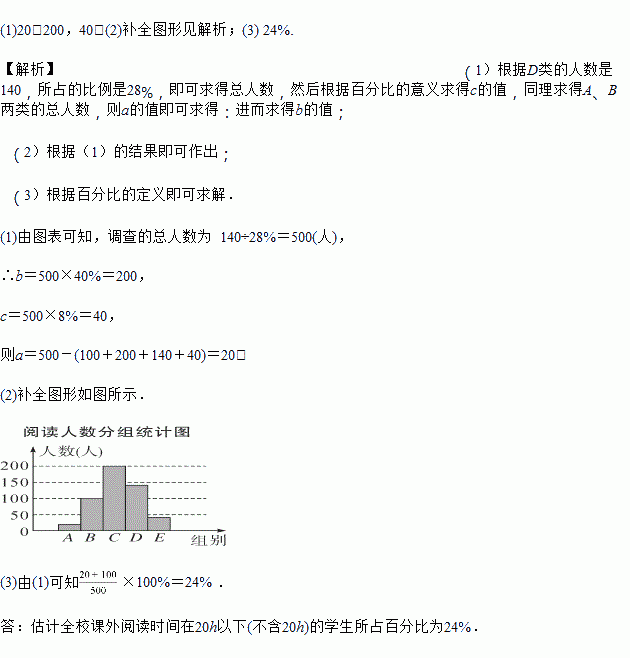 (3)¹À¼ÆÈ«Ð£¿ÎÍâÔĶÁʱ¼äÔÚ20hÒÔÏÂ(²»º¬20h)µÄѧÉúËùÕ¼°Ù·Ö±È£®