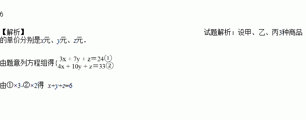有甲、乙、丙3种商品,某人若购甲3件、乙7件、丙1件共需24元;若购甲4件、乙10件、丙1件共需33元,则此人购甲、乙、丙各一件共需_____ 元。